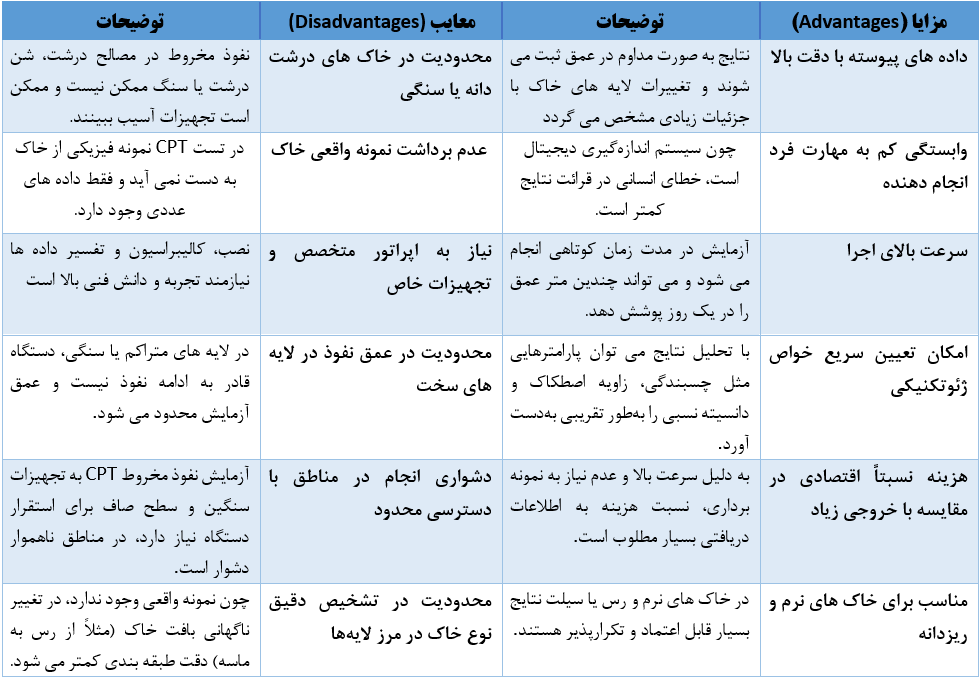 از جمله محاسن و معایب آزمایش نفوذ مخروط سی پی تی می توان به موارد زیر اشاره کرد.
