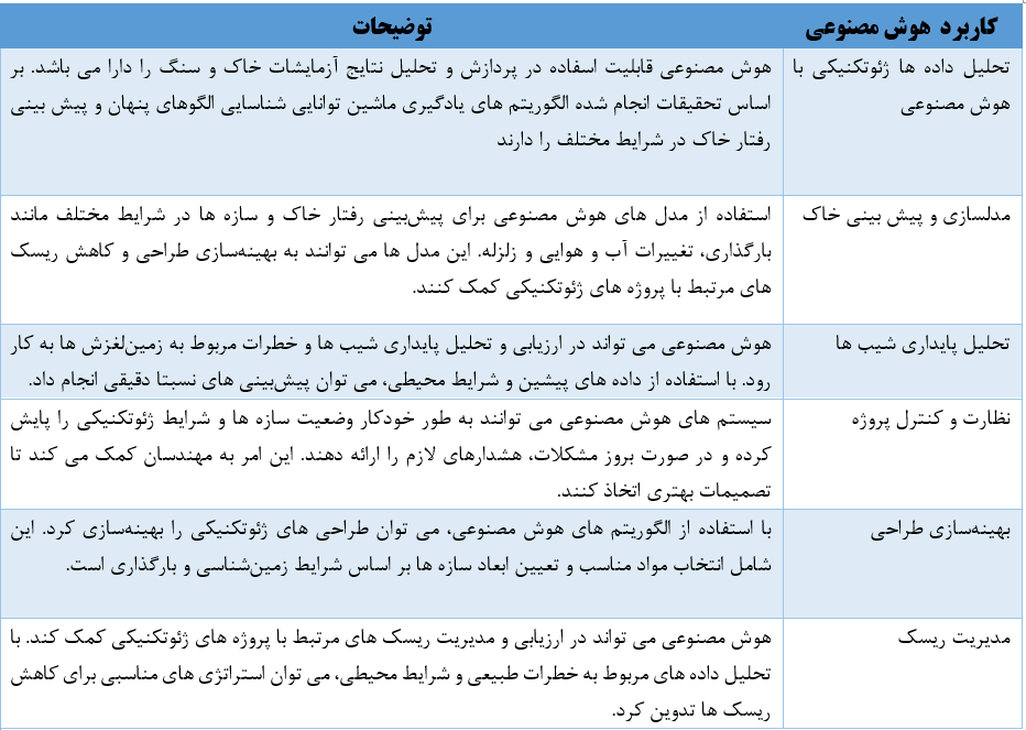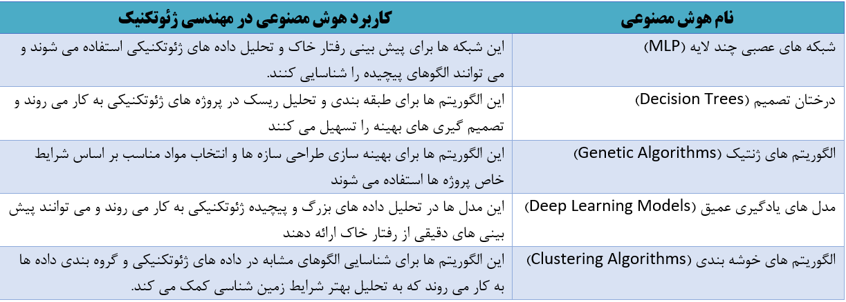 در زیر پنج فناوری پرکاربرد هوش مصنوعی در مهندسی ژئوتکنیک به همراه توضیحی مختصر درباره کاربرد هر یک آورده شده است.